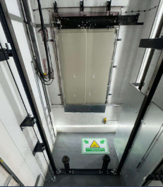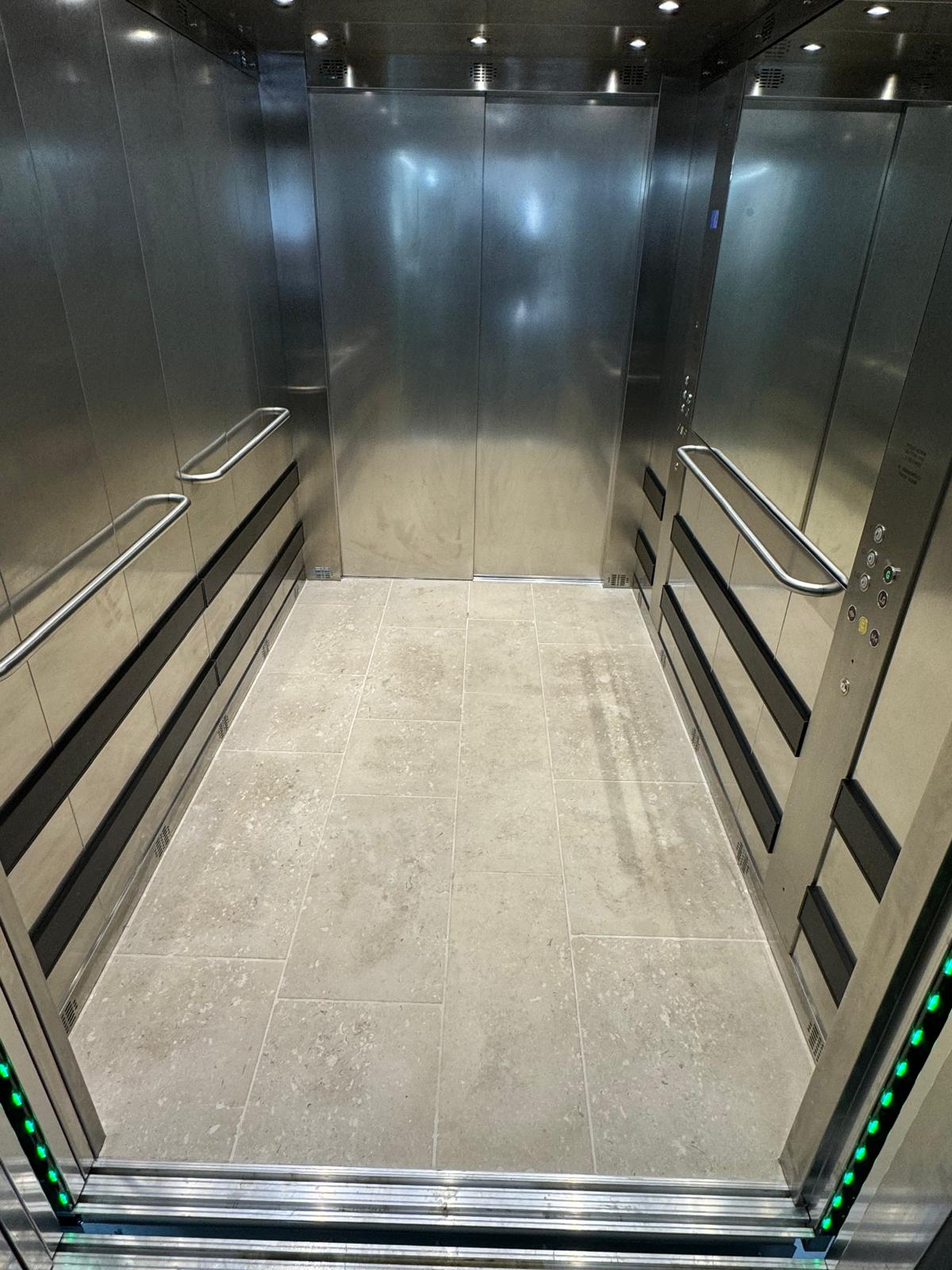 The new installation is a through car, replacing a hydraulic lift with a modern motor-room less lift.