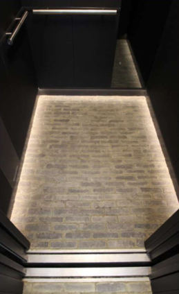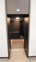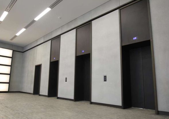 New triplex lift installation in a commercial office building with bespoke finishes, including adjacent opening firefighting lift.